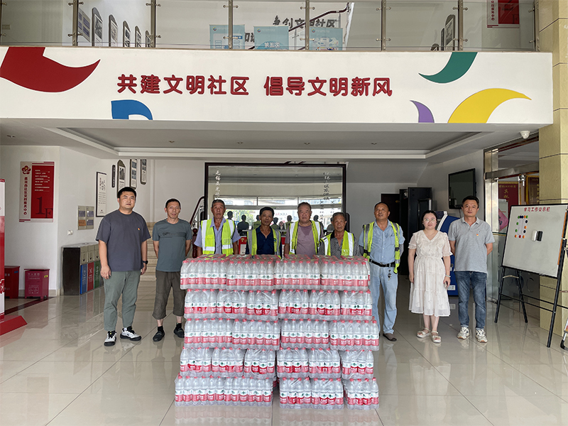 7月22日下午,希恩公司组织党员代表和公司代表来到村委,为坚守岗位、默默奉献的环卫工人送上矿泉水,不仅为他们带去一丝清凉,也为城市的文明和进步增色添彩。